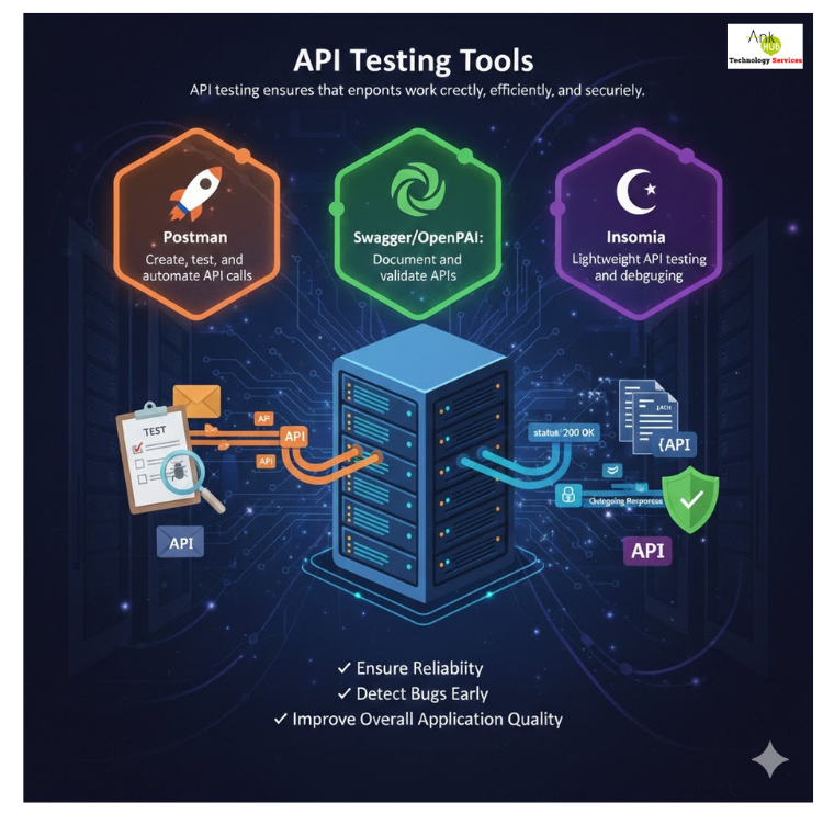 API testing ensures that endpoints work correctly, efficiently, and securely. Popular tools include: